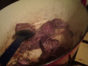 2. Retirer de la marinade la viande et la placer dans une passoire pour l'égoutter. Dans une cocotte, faire rissoler dans l'huile et le beurre les morceaux de bœuf sur toutes les faces, réserver.