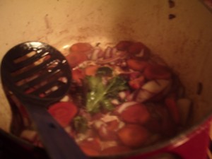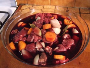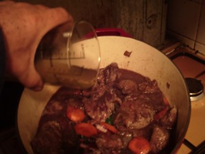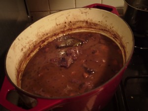 | 5. Mouiller avec la marinade, le fond de veau. Porter à ébullition puis couvrir la cocotte. et mettre au four (thermostat 180°C) pendant 2h. A mi-cuisson rajouter le chocolat. Durant la cuisson, remuer plusieurs fois avec une spatule. | ![]() |