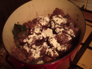 4. Rajouter ensuite les morceaux de viande , singer (mettre de la farine pour la liaison de la sauce). Remuer. |