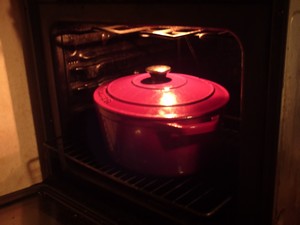 | 5. Mettre la cocotte au four (thermostat 180°C) pendant 2h. A mi-cuisson rajouter le chocolat. Durant la cuisson, remuer plusieurs fois avec une spatule. | ![]() |
